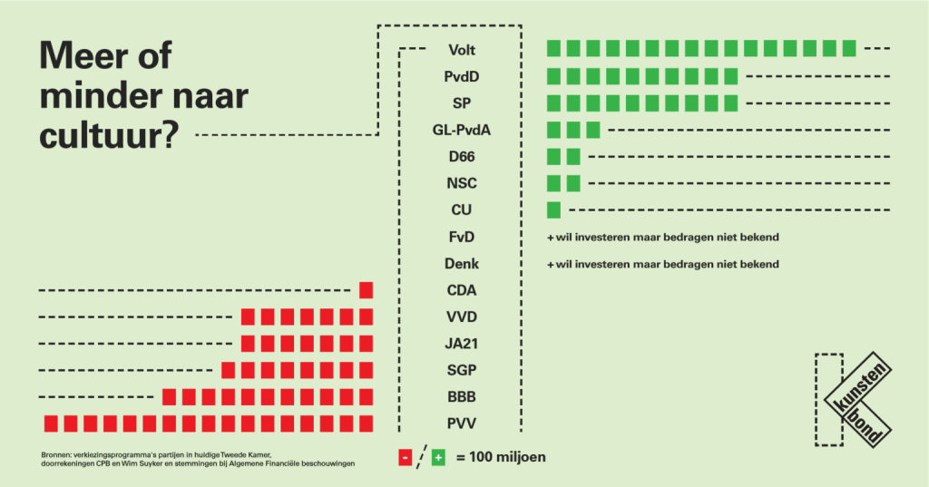 Kunst, media en cultuur maken Nederland levendig, kritisch en verbonden. Toch verschilt het sterk per politieke partij hoeveel waarde zij hier in euro’s aan toekennen. Hieronder zie je wat politieke partijen willen investeren of bezuinigen op kunst, cultuur en media.